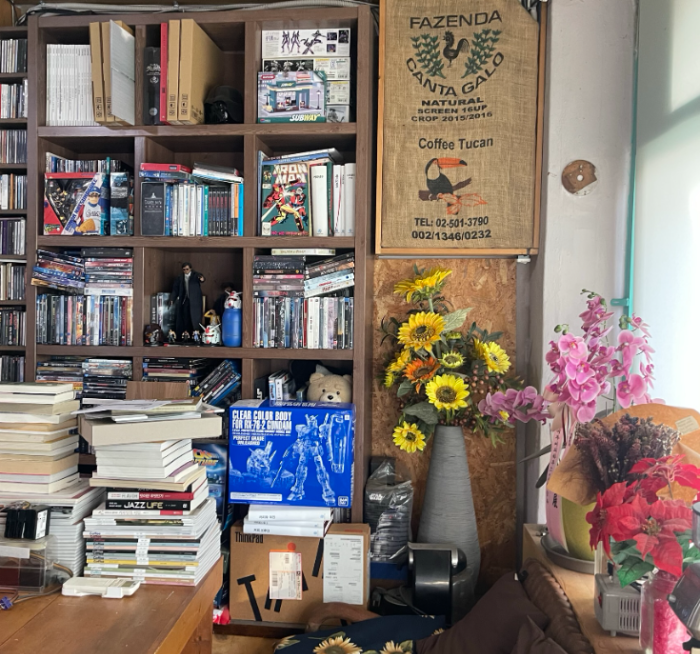 처음에 들어서면 각종 피규어와 건담 프라모델, 만화책 등이 가득찬 책장이 반겨줍니다.