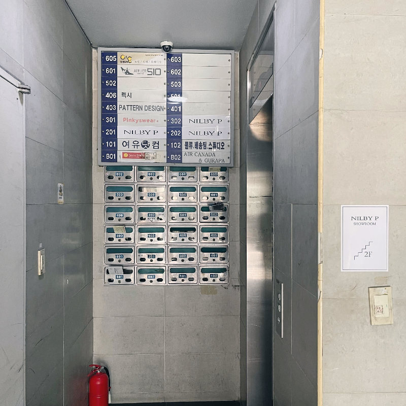 입간판이 있는 건물로 들어서면 닐바이피 쇼룸은 2층에 있다는 안내판이 보입니다.