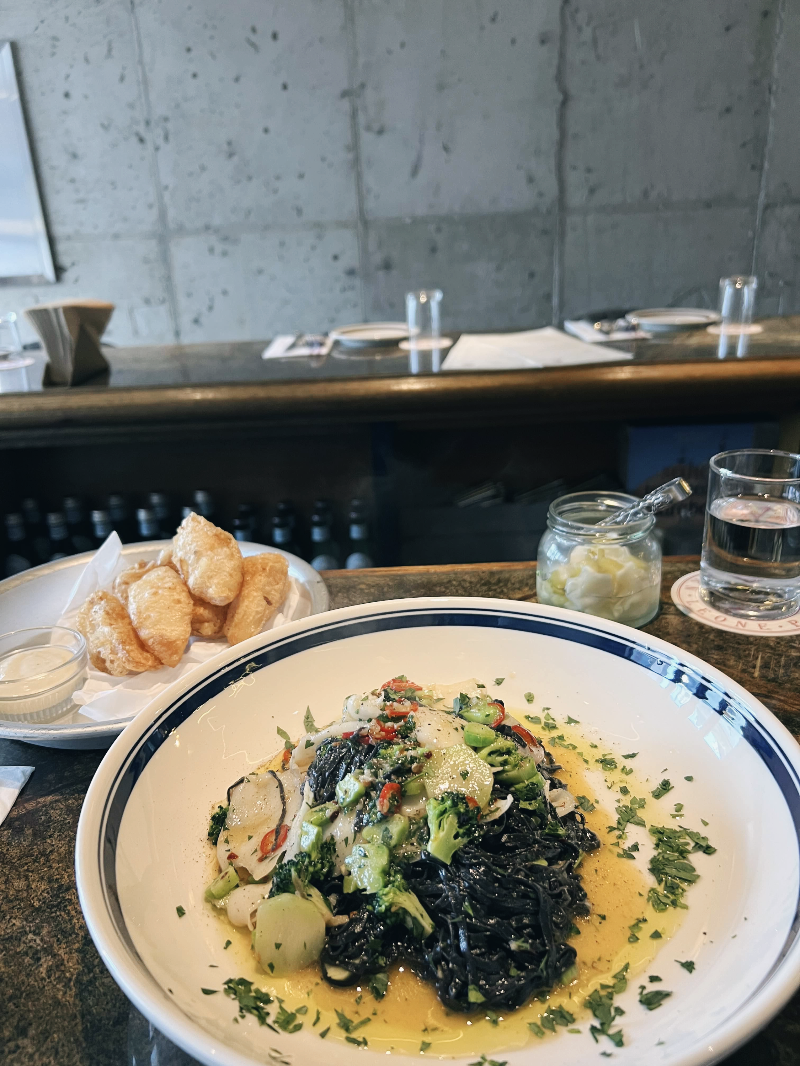 얇게 저민 갑오징어와 브로콜리, 칠리, 올리브 오일, 그리고 오징어 먹물로 반죽한 면이라고 설명하시더라구요.