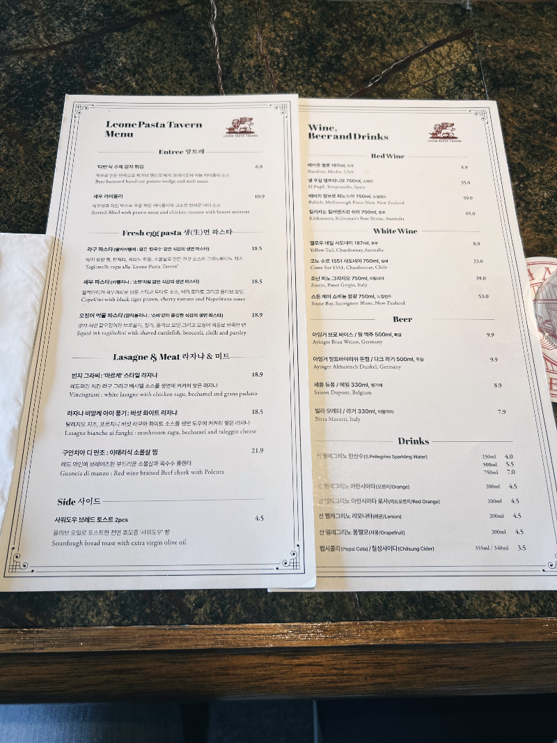 메뉴는 크게 앙트레, 생면 파스타, 라자냐 & 미트, 사이드로 분류 되어 있고 그 외 레드 와인, 화이트 와인, 맥주, 탄산수 등의 음료 메뉴판이 따로 있었어요.