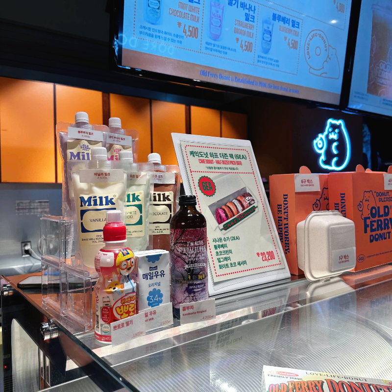 케익도넛 하프 더즌 팩 광고와 음료(시그니처 밀크 등)가 전시되어있네요.