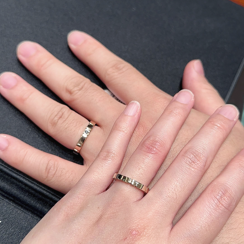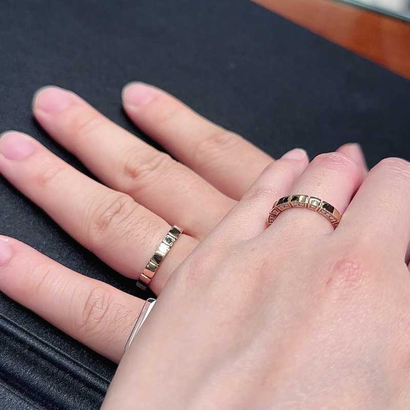 대전에서 껴본 피아제 웨딩밴드들은 회전이 굉장히 스무스 했고 거슬리는 점이 없어서 우리는 회전해도 괜찮은가보다 했는데 더현대 대구의 피아제 웨딩밴드들은 회전축이 이미 고장난 건지 부드럽게 돌아가지 않고 반지를 흔들어보면 쇳소리가 심하게 났어요. (굳이 흔들어본건 피아제 실사용 후기에 반지를 흔들면 소리가 난다고 해서 시험해본거예요.)