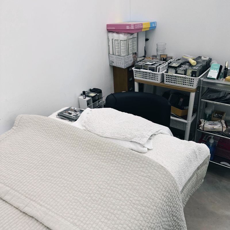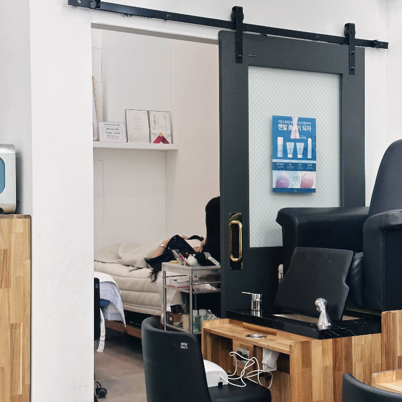속눈썹 펌은 저 너머 침대가 있는 공간에서 이루어져요.