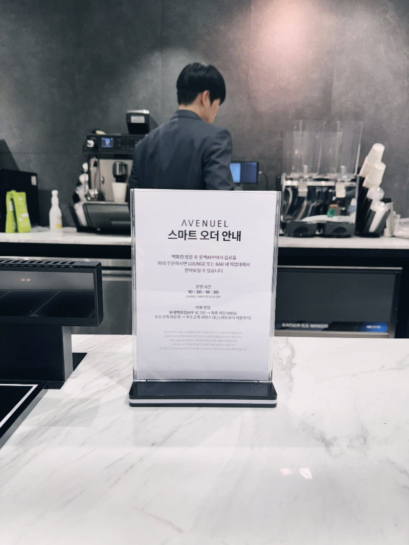 기다리게 해서 죄송하다는 말과 함께 받은 음료 쿠폰으로 에비뉴엘 바에 갔습니다.
