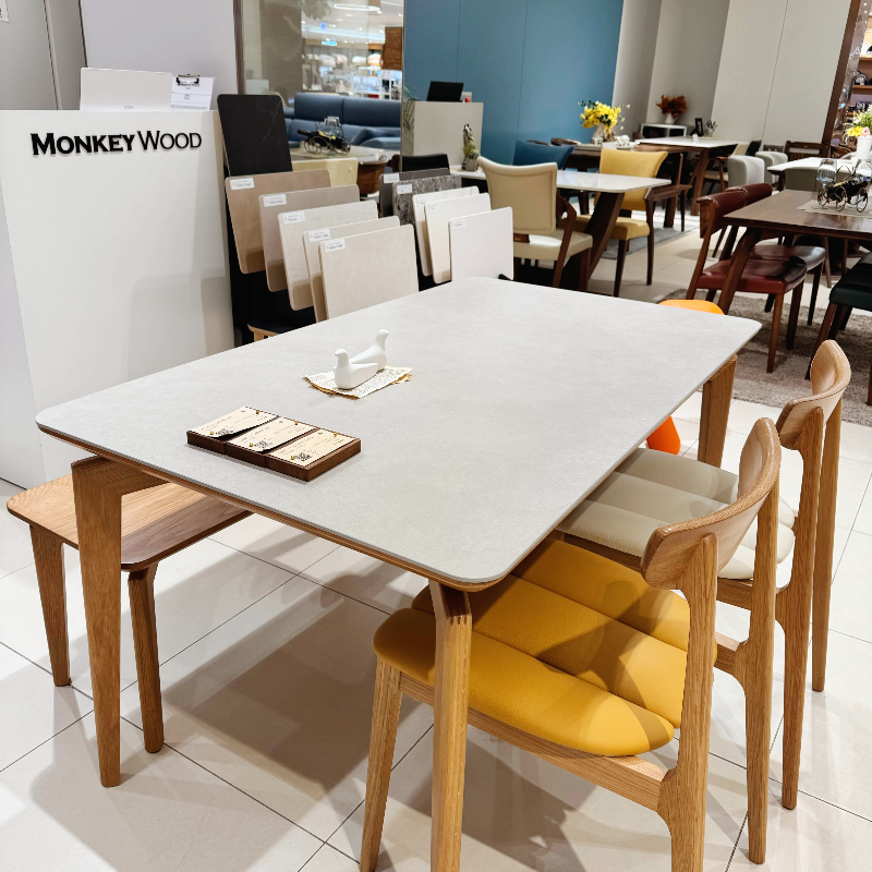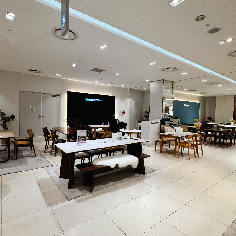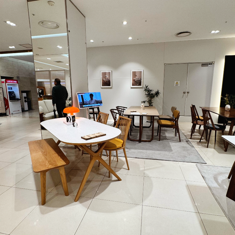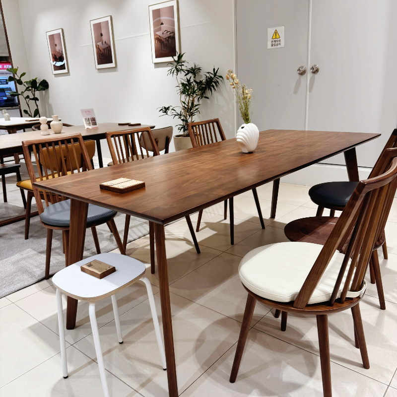 디스플레이 된 식탁들을 두드려도 보고 흔들어도 봤는데 흔들림 없이 굉장히 견고하고 두드렸을 때의 소리도 거슬리지 않는 정도의 울림이라 몽키우드로 구매해도 좋을 거 같다는 생각이 들었어요.