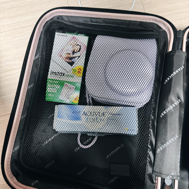 저는 옛날에 받았던 스타벅스 미니 캐리어에 폴라로이드, 인공눈물, 까르띠에 웨딩밴드 등을 넣어서 갔었어요. :)