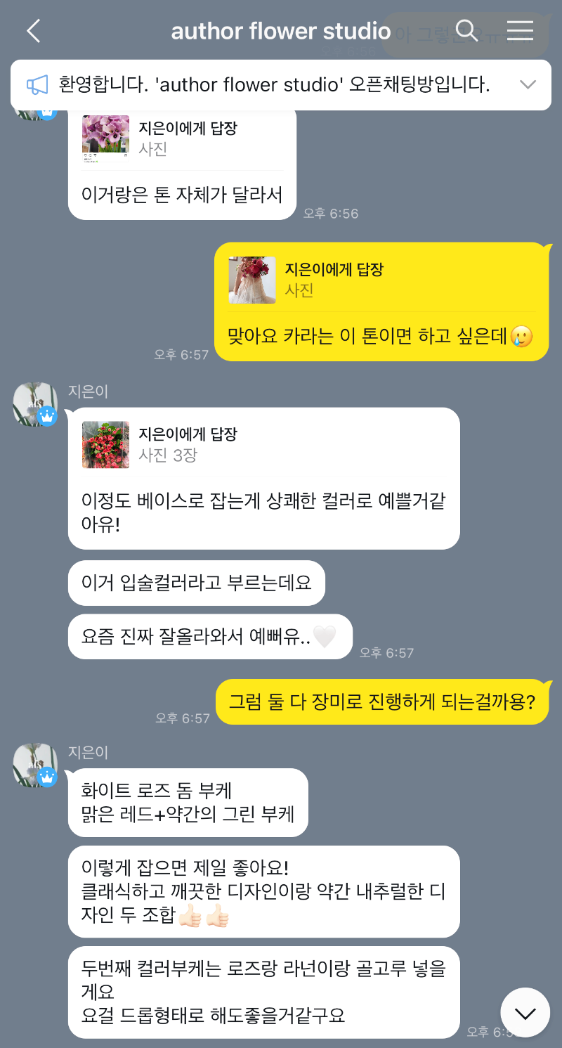 이 색깔의 카라가 있으면 카라 부케도 고민을 했었는데 아쉽게도 제가 찾는 색깔의 카라는 지금 안 나온대서ㅠㅠ