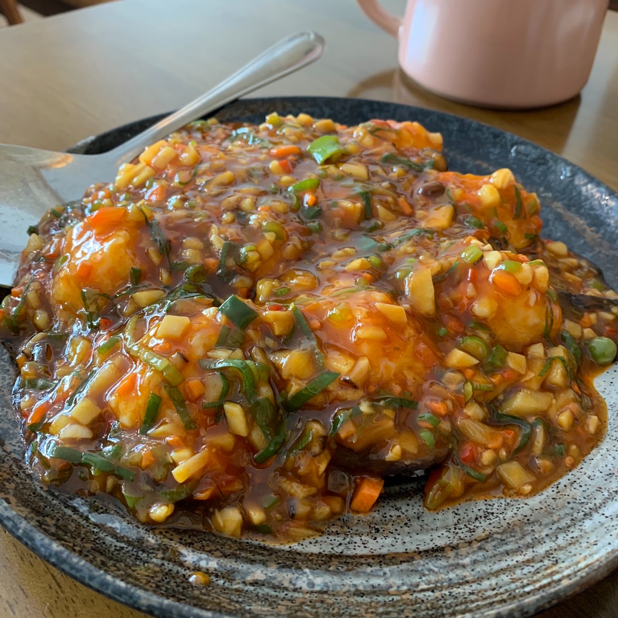 버섯 위에 새우완자가 올라가있는데 매콤달콤한 소스에 한 입 베어물면 쫙 퍼지는 버섯향과 오동통한 새우완자ㅠㅠ