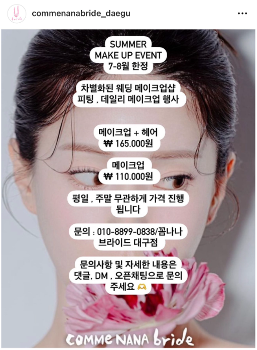마침 제가 본식 메이크업을 하기로 예정되어 있던 꼼나나브라이드 대구점에서 8월 이벤트를 하는게 아니겠습니까^ㅇ^
