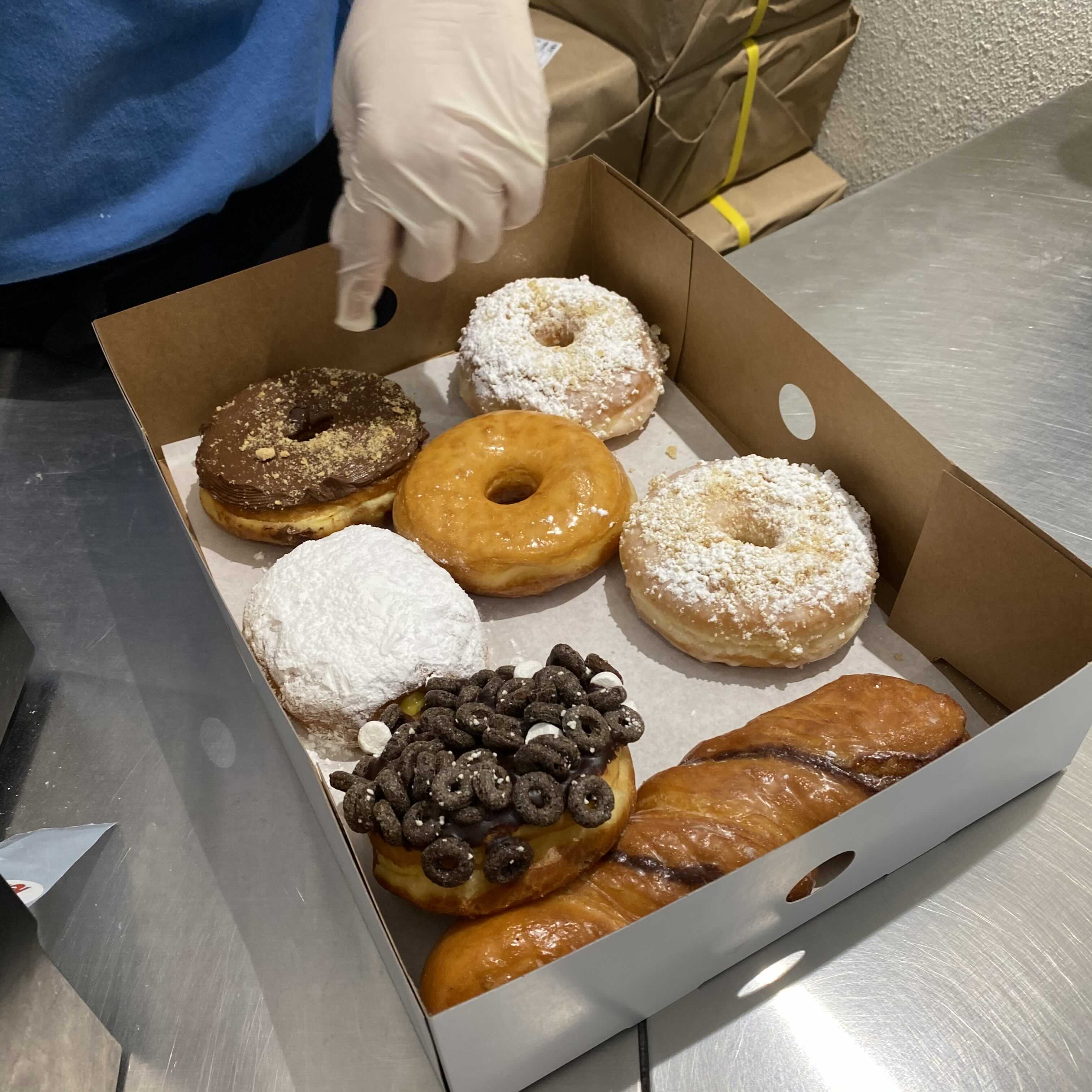 저는 버터크림, 메이플츄러스, 누텔라, 타이거테일, 베어클라우, 초콜릿초코롱존, 오레오오즈도넛, 글레이즈드로 정해놓고 갔는데 메이플츄러스, 베어클라우, 초콜릿초코롱존은 없어서 버터크림 한 개 더 추가하고 레몬필링도넛으로 대체했어요.