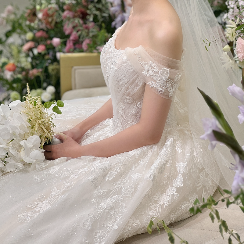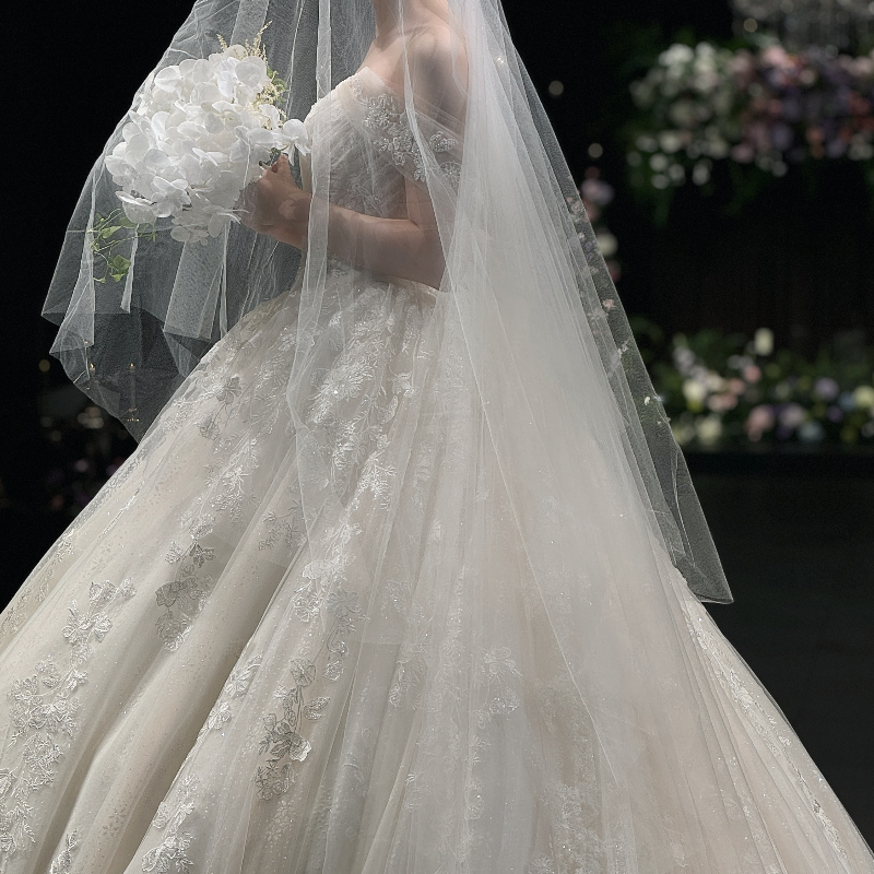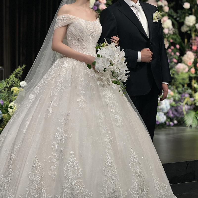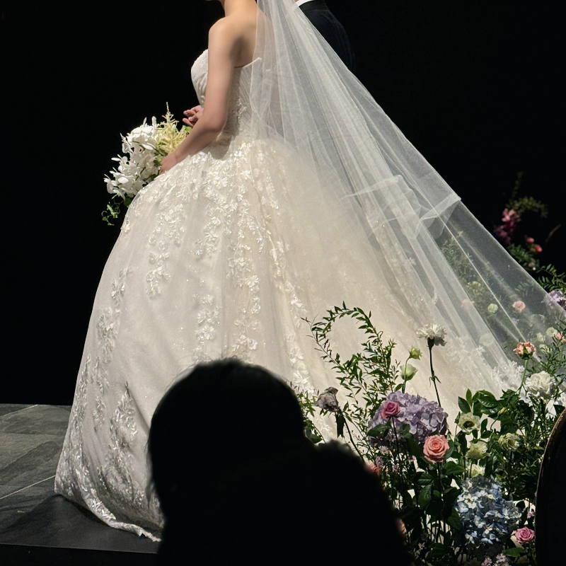 제 본식 드레스가 프렌치 자수의 클래식한 레이스 드레스였는데 차르르한 잔잔비즈 섞인 드레스였거든요.