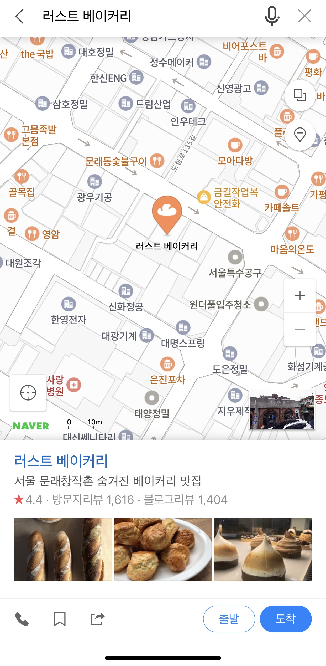 아래는 네이버 지도 앱에서 검색한 러스트 베이커리 주소 및 위치예요.