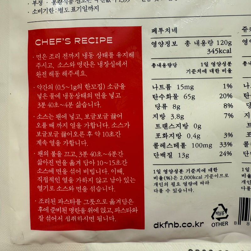 포노 부오노 명란 쥬키니 오일 파스타는 페투치네 면으로 만들어지고 페투치네는 총 내용량 120g 기준 345 칼로리입니다.