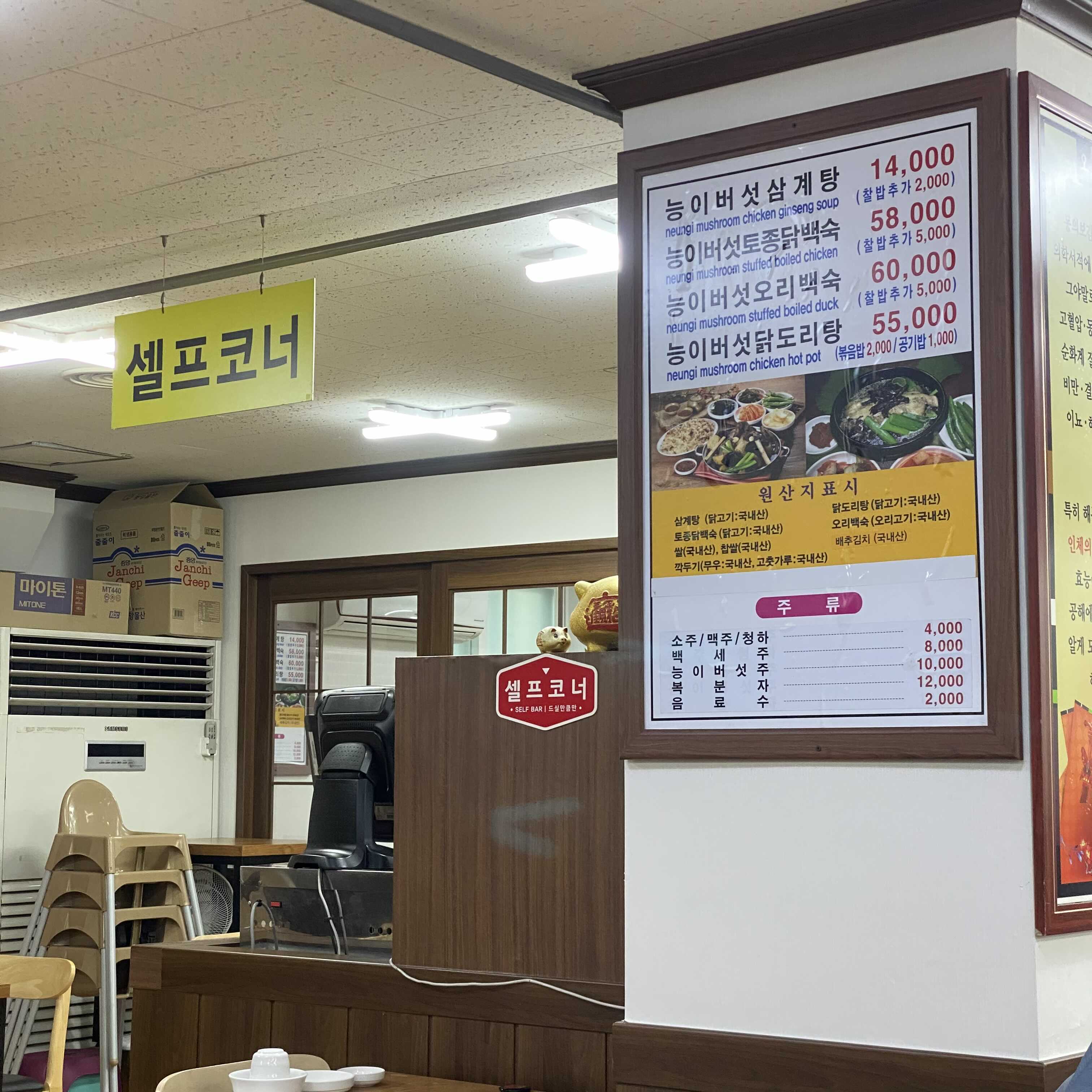 메뉴판입니다. 저희는 능이버섯 삼계탕을 시켰어요.