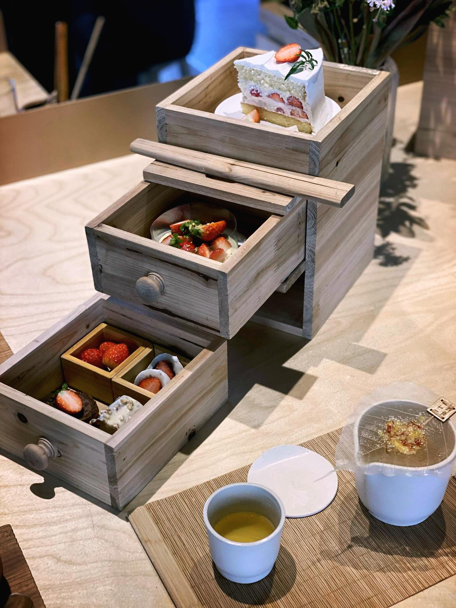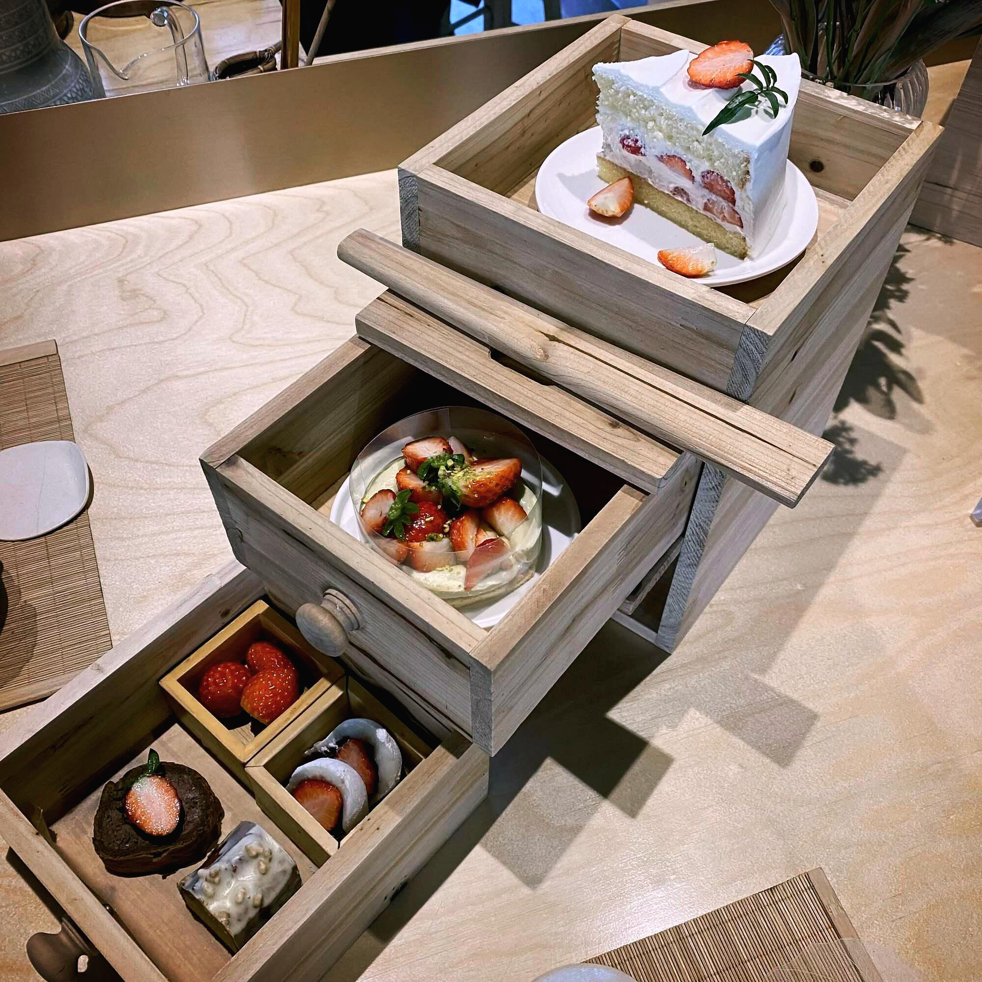 세번째 칸에 들어간 디저트들은 보이시는 그대로 딸기와 딸기 찹쌀떡, 딸기 초코크림 케이크, 다른 하나는 지금 이름이 생각나지 않는데 아마 쌀...과 관련 되었던 거 같아요. 많이 달지 않았던 기억이 나네요.