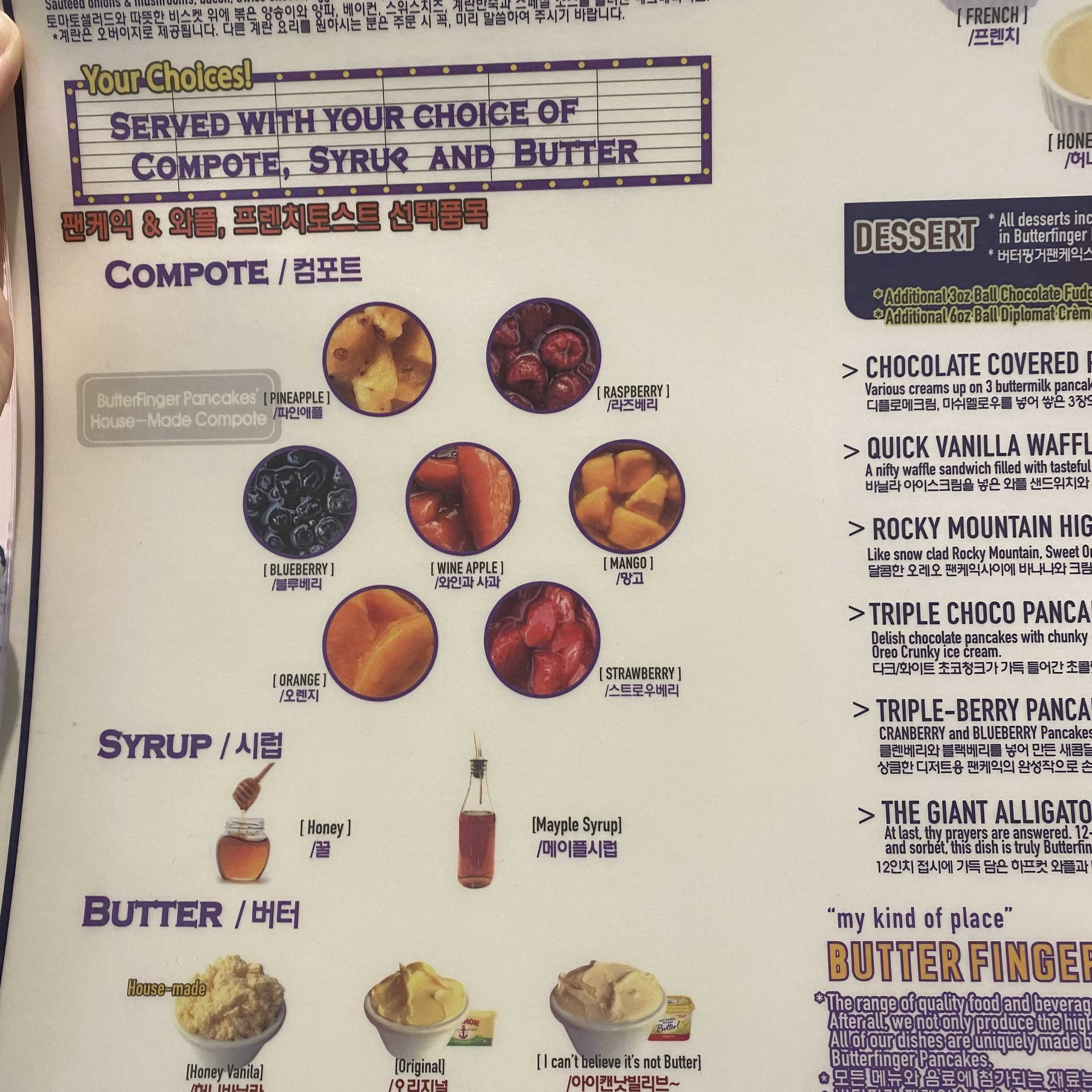저는 이번에 토스트와 팬케이크를 먹었는데 메뉴별로 컴포트와 시럽, 버터 선택이 가능합니다.